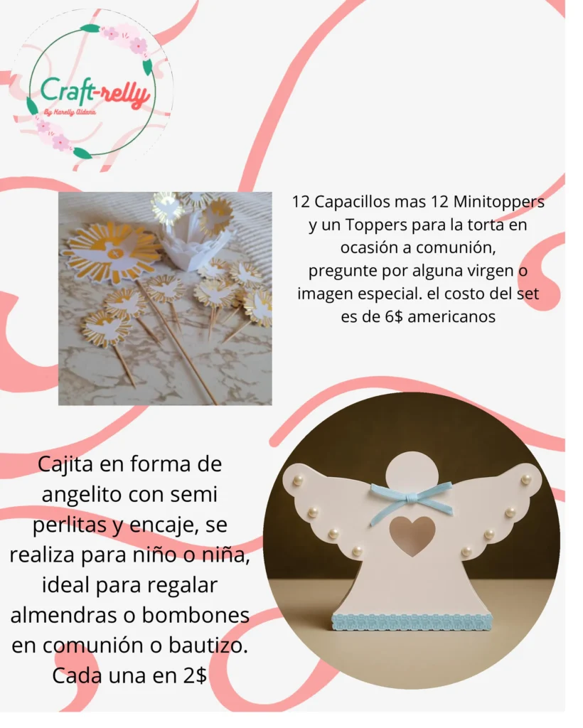 Cajita en forma de angelito con semi perlitas y encaje, se realiza para niño o niña, ideal para regalar almendras o bombones en comunión o bautizo. Cada una en 2 $.